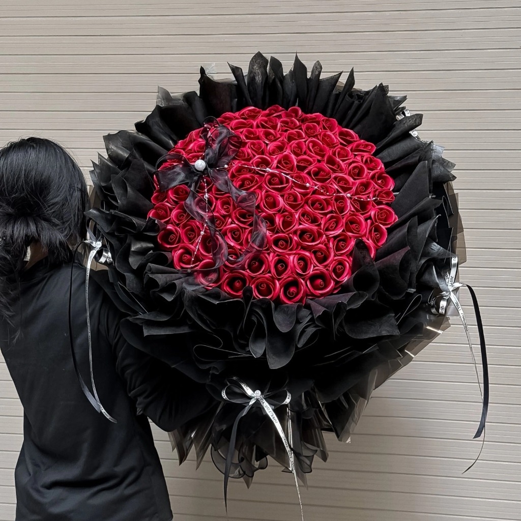 Điểm đặc biệt nằm ở cách bó: từng lớp giấy đen được xếp tầng cầu kỳ, tạo độ phồng và độ rủ mềm mại như một chiếc váy dạ hội sang trọng. Chính sự tương phản giữa nền đen và sắc đỏ đã làm nổi bật từng bông hoa, khiến tổng thể trở nên cuốn hút, có chiều sâu và đầy khí chất. Đây không đơn thuần là bó hoa, mà là một “tuyên ngôn” về tình yêu – mạnh mẽ, rõ ràng và không hề nhạt nhòa.