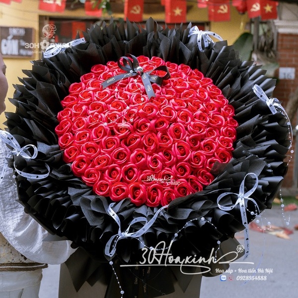 Không chỉ là một bó hoa, đây là biểu tượng của tình yêu mãnh liệt và sự trân trọng tuyệt đối. 99 bông hoa sáp màu đỏ đại diện cho lời hứa “mãi mãi bên nhau”, một tình yêu bền chặt, không đổi thay theo thời gian. Sắc đỏ nồng nàn kết hợp cùng giấy gói đen huyền bí tạo nên sự tương phản đầy ấn tượng – vừa nổi bật, vừa sang trọng, khiến bó hoa trở thành tâm điểm ngay từ ánh nhìn đầu tiên.