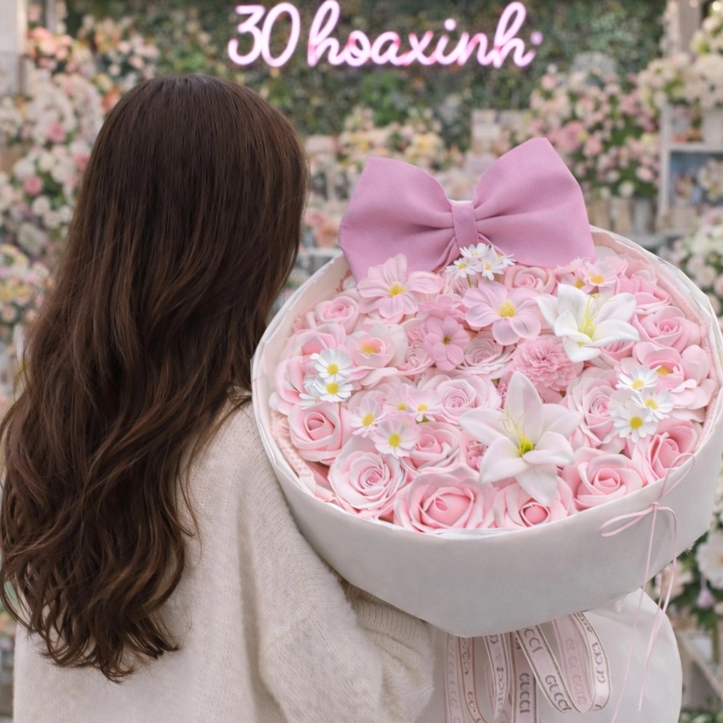 Bó hoa được kết dạng tròn cân đối, phối nhiều sắc độ hồng khác nhau tạo chiều sâu và sự mềm mại. Từ hồng pastel nhẹ nhàng đến hồng đậm nổi bật, tất cả hòa quyện tạo nên tổng thể nữ tính, sang trọng và rất dễ gây thiện cảm ngay từ ánh nhìn đầu tiên.