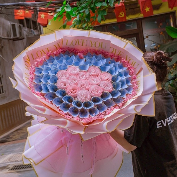 Người nhận không chỉ bất ngờ vì bó hoa đẹp mà còn cảm thấy vui vì món quà vừa dễ thương vừa thực tế.