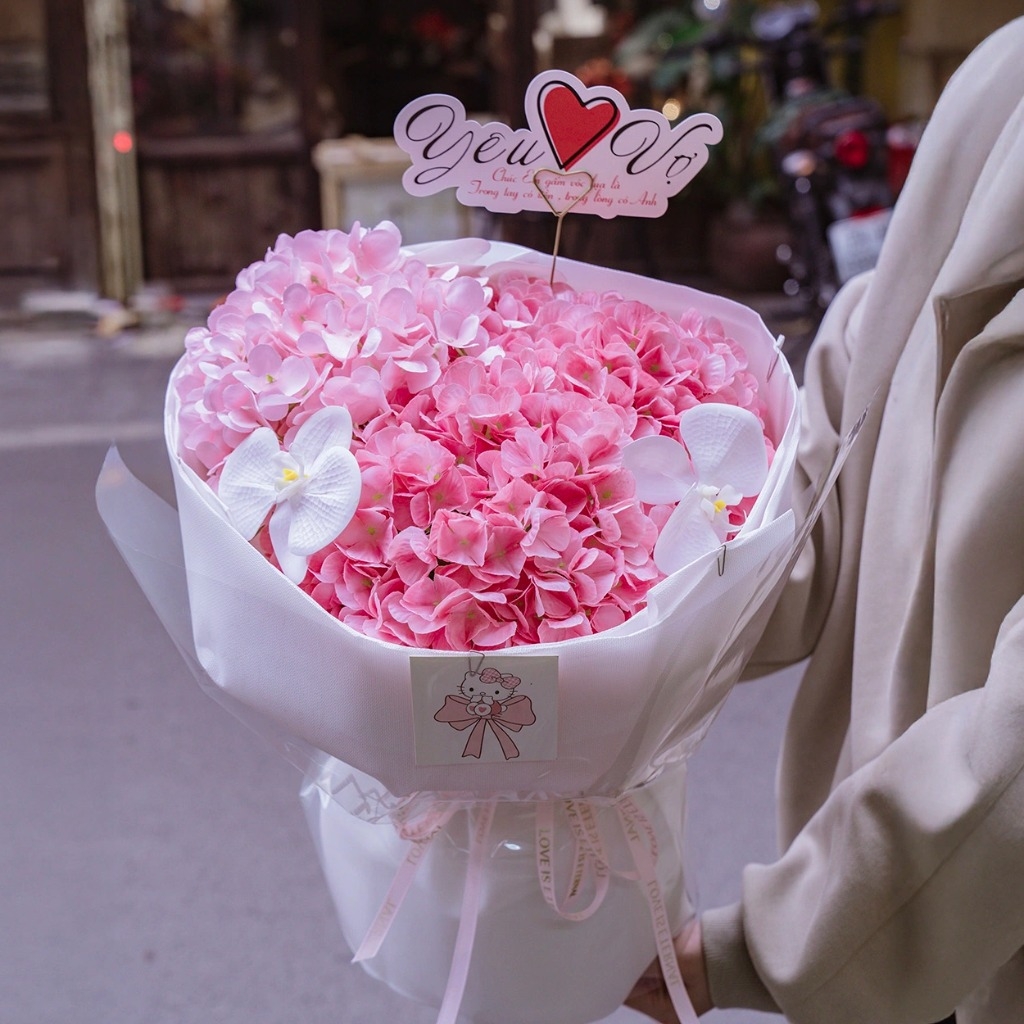 Lấy cảm hứng từ vẻ đẹp tự nhiên của Cẩm tú cầu, sản phẩm được thiết kế với chùm hoa tròn đầy, cánh lụa xếp dày, màu hồng pastel dịu dàng. Sắc hồng tượng trưng cho sự quan tâm, yêu thương chân thành và những cảm xúc ngọt ngào khó nói thành lời.