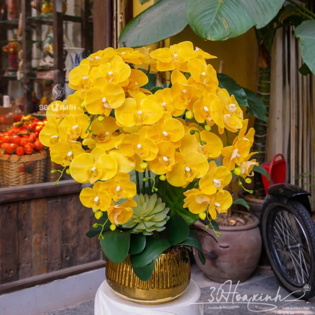 Lấy cảm hứng từ vẻ đẹp dịu dàng của hoa lan tại Đà Lạt, chậu lan hồ điệp cao su non 7 cành màu vàng mang đến cảm giác nhẹ nhàng, tinh tế nhưng vẫn nổi bật nhờ sắc vàng tươi sáng. Sản phẩm là sự kết hợp hài hòa giữa tính thẩm mỹ và giá trị sử dụng lâu dài, phù hợp để trang trí hoặc làm quà tặng trong nhiều dịp.