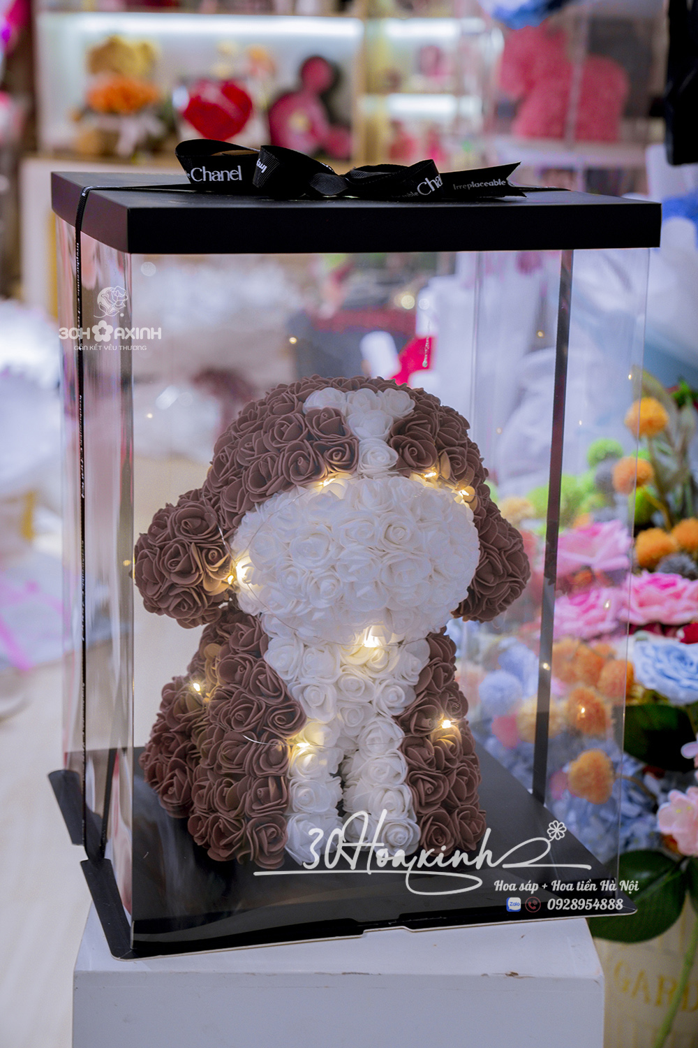 Không phải là một chú gấu bông thông thường – mà là chú cún con đáng yêu được kết tỉ mỉ từ 500 bông hoa hồng baby nhỏ xinh, mang theo từng nhịp thương yêu thầm lặng nhưng sâu sắc.