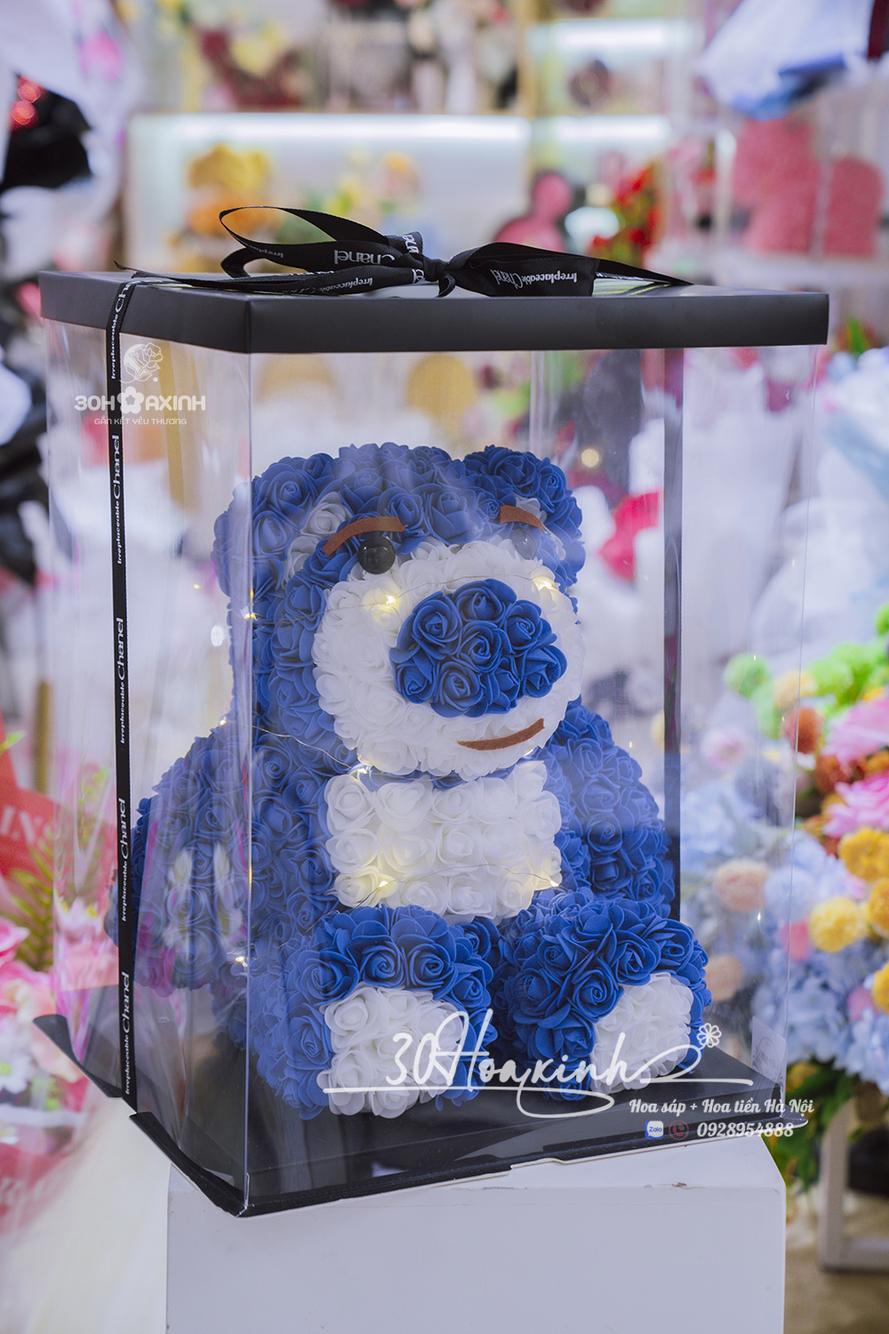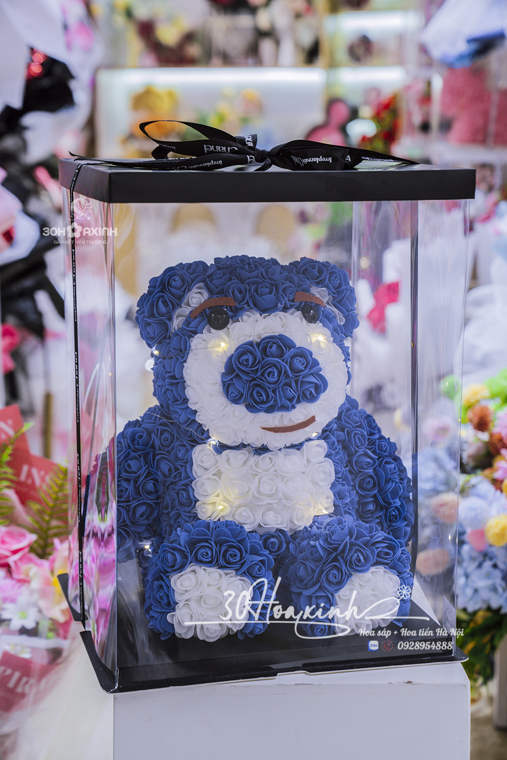🌟 Gấu được đặt trong hộp mica trong suốt, xung quanh có đèn led phát sáng lung linh – như một món quà cổ tích giữa đời thật.