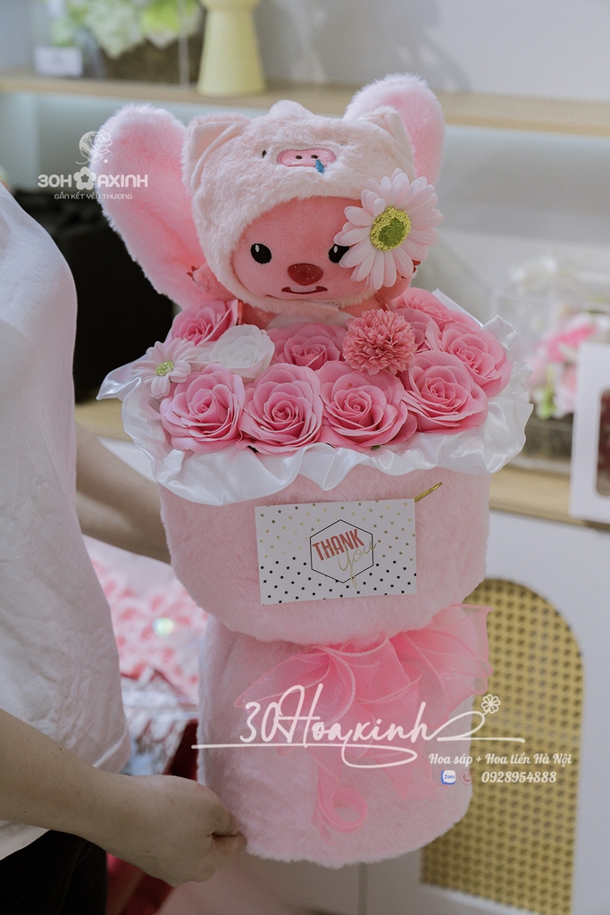Không chỉ dễ thương mà còn đầy ý nghĩa, gấu Loopy ôm hoa sáp thơm màu hồng là món quà khiến ai nhận cũng phải mỉm cười. Chú gấu Loopy với gương mặt ngộ nghĩnh, vòng tay ôm trọn bó hoa sáp hồng mềm mại – như gửi đi thông điệp: “Yêu thương này luôn được nâng niu”.