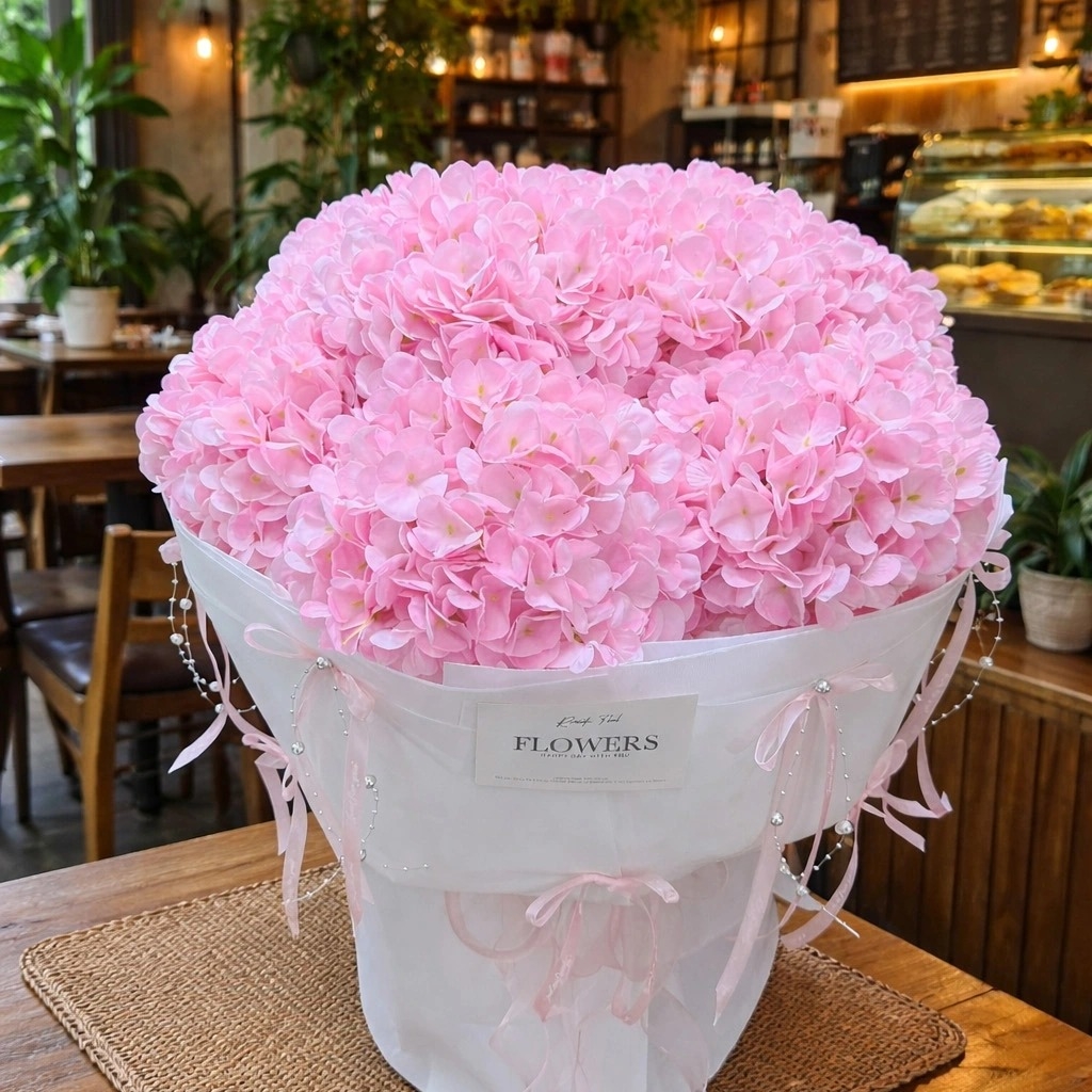 Lấy cảm hứng từ vẻ đẹp của hoa Cẩm tú cầu, sản phẩm được thiết kế với chùm hoa tròn đầy, cánh lụa mềm mại và sắc hồng pastel dịu dàng. Tông màu này tượng trưng cho sự quan tâm, chân thành và những cảm xúc ngọt ngào khó nói thành lời.