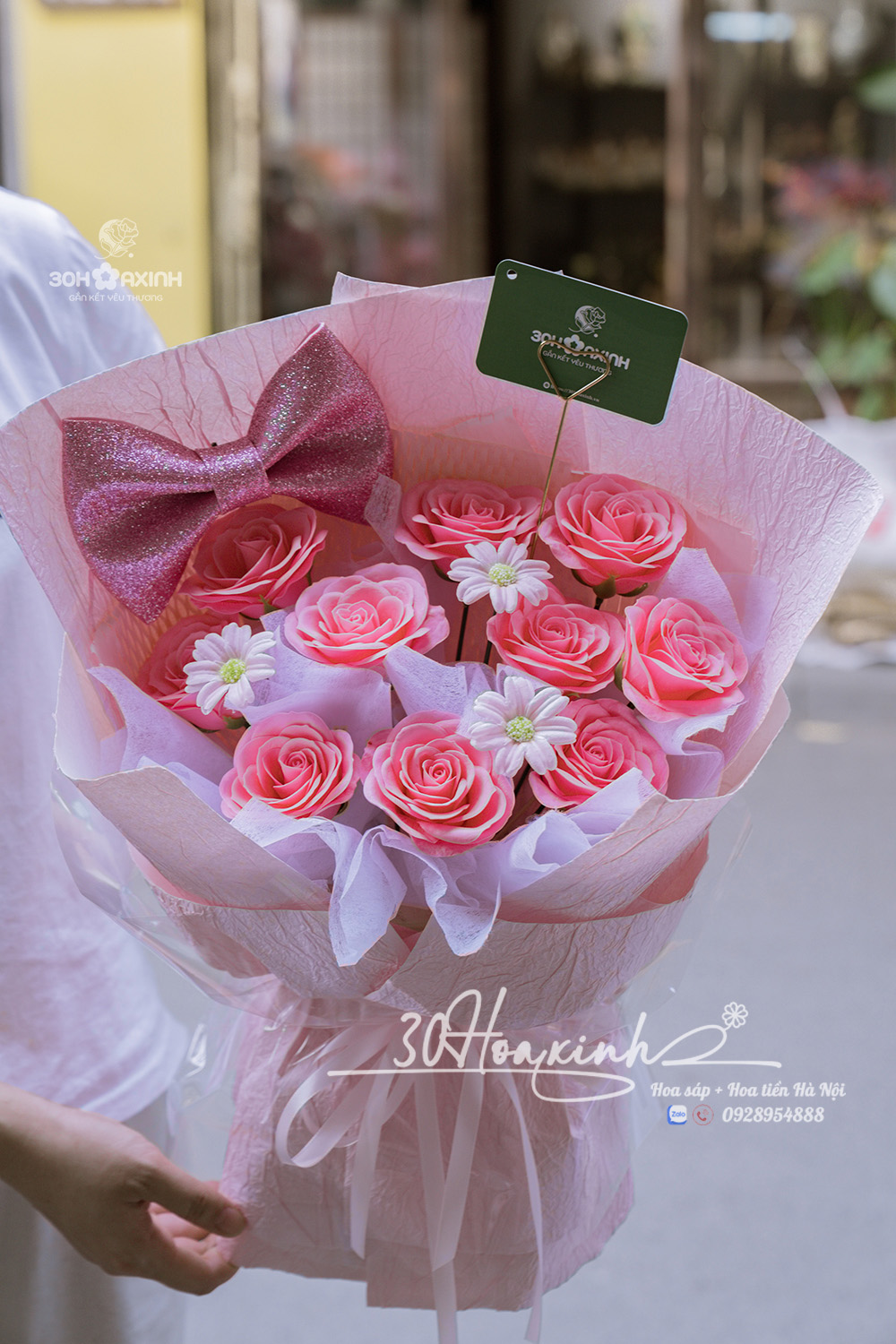 Mười bông hoa hồng sáp mềm mại, màu hồng dịu dàng tượng trưng cho tình yêu trong sáng và sự quan tâm chân thành. Dải nơ được buộc khéo léo càng làm bó hoa thêm phần tinh tế, như một lời gửi gắm nhẹ nhàng: “Mình thương bạn thật nhiều”.