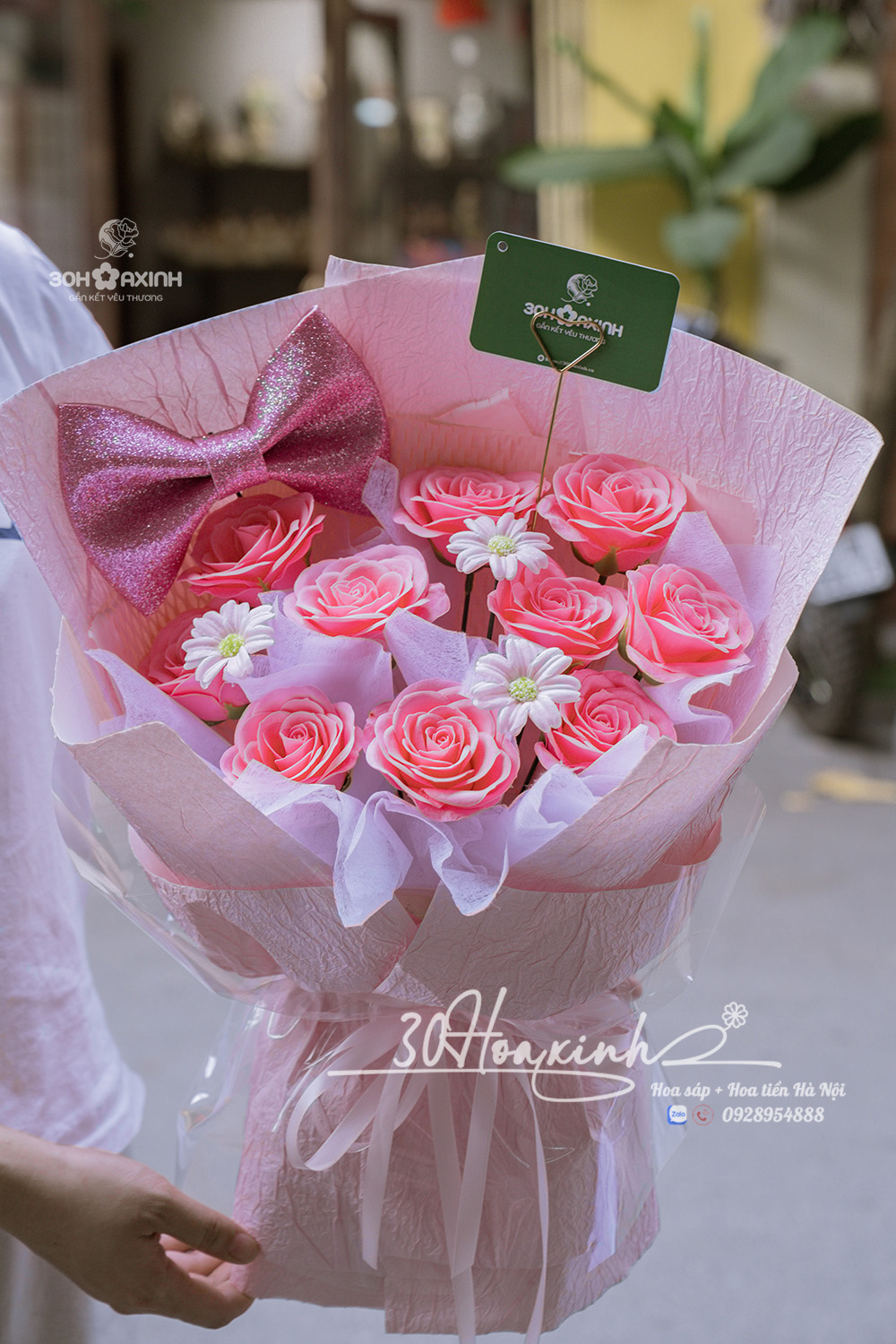 Nếu bạn cũng đang tìm một món quà nhỏ mà ý nghĩa, hãy đặt trước bó hoa sáp hồng 10 bông kèm nơ để mình chuẩn bị thật chỉn chu giúp bạn nhé.