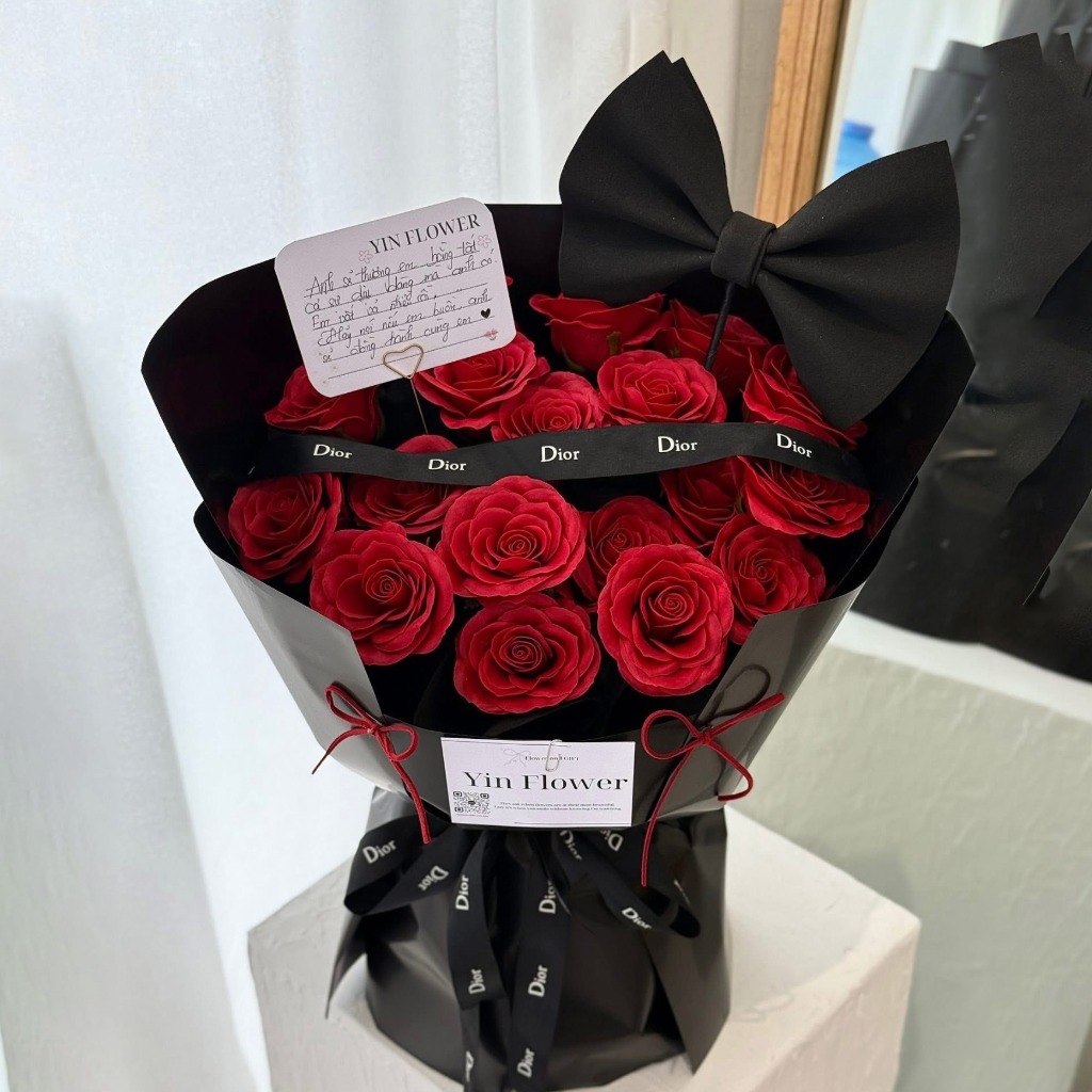 Bó hoa được gói bằng giấy đen cao cấp, tạo nên sự tương phản hoàn hảo với sắc đỏ rực rỡ của hoa. Thiết kế này mang phong cách sang trọng – hiện đại – tinh tế, phù hợp với những ai yêu thích sự khác biệt và đẳng cấp.