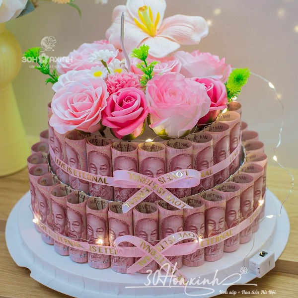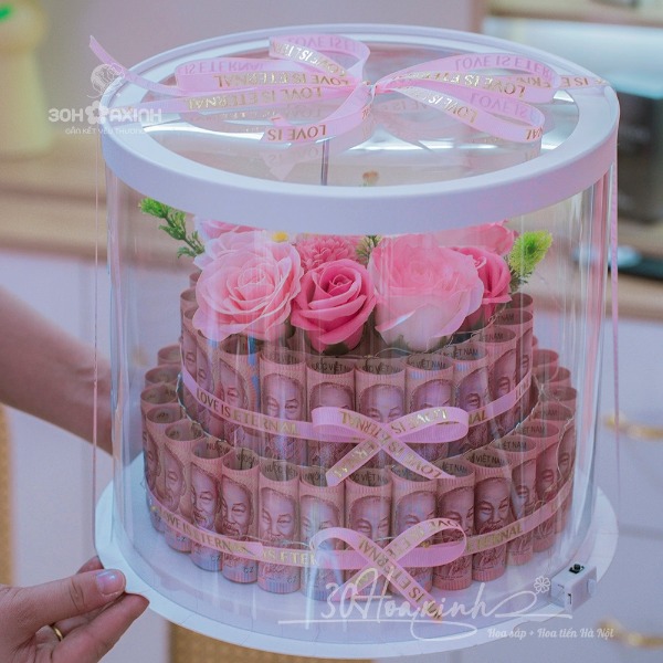 Hộp hoa bánh sinh nhật đựng tiền, có thể thay đổi mệnh giá tiền trong hộp và số lượng tờ tiền