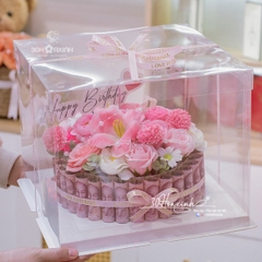 Hộp hoa tạo hình bánh sinh nhật, đựng trong hộp mica trong suốt. Cửa hàng có làm khuôn tiền theo yêu cầu, có thể thay đổi mệnh giá tiền trong hộp và số lượng tờ tiền