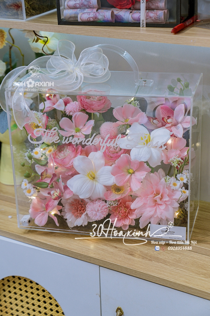 Bên trong chiếc vali trong suốt là những bông hoa sáp được sắp xếp khéo léo, màu sắc nhẹ nhàng, kèm ánh đèn led lung linh tạo cảm giác ấm áp và lãng mạn. Mỗi khi bật đèn lên, cả chiếc vali như sáng bừng, gợi nhớ đến những kỷ niệm ngọt ngào và những người ta luôn trân quý.
