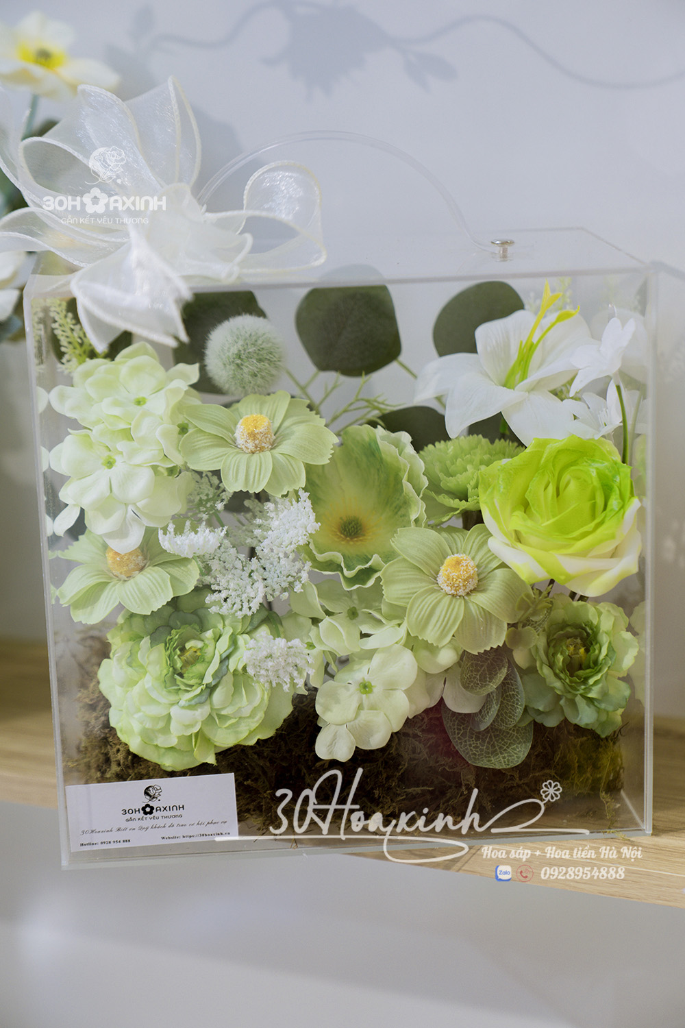 Không quá rực rỡ nhưng lại khiến người ta nhớ mãi, hộp vali mica hoa sáp màu xanh matcha mang đến cảm giác thanh khiết và dễ chịu ngay từ ánh nhìn đầu tiên. Sắc xanh matcha tượng trưng cho sự tươi mới, bình an và những khởi đầu đầy năng lượng tích cực.