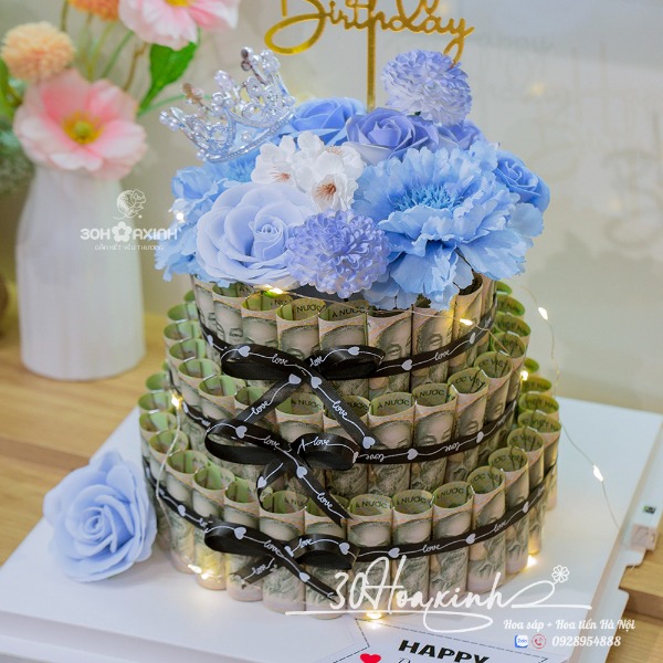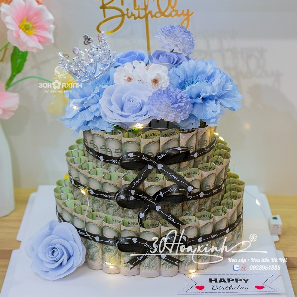 Bánh sinh nhật làm từ 75 tờ tiền 100k, xếp thành 3 tầng đẹp mắt, sang trọng, mang ý nghĩa vừa chúc mừng vừa chúc phát tài!