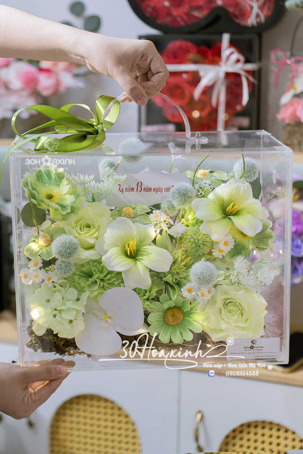 Sắc xanh lá tượng trưng cho sự bình an và hy vọng, mang đến cảm giác dễ chịu ngay từ ánh nhìn đầu tiên. Bên trong vali là những bông hoa sáp được sắp xếp tỉ mỉ, ánh đèn led lung linh càng làm cho món quà thêm phần nổi bật và sang trọng. Dù tặng cho người thân, bạn bè hay người thương, chiếc vali nhỏ này đều khiến người nhận cảm thấy được yêu thương và trân trọng.