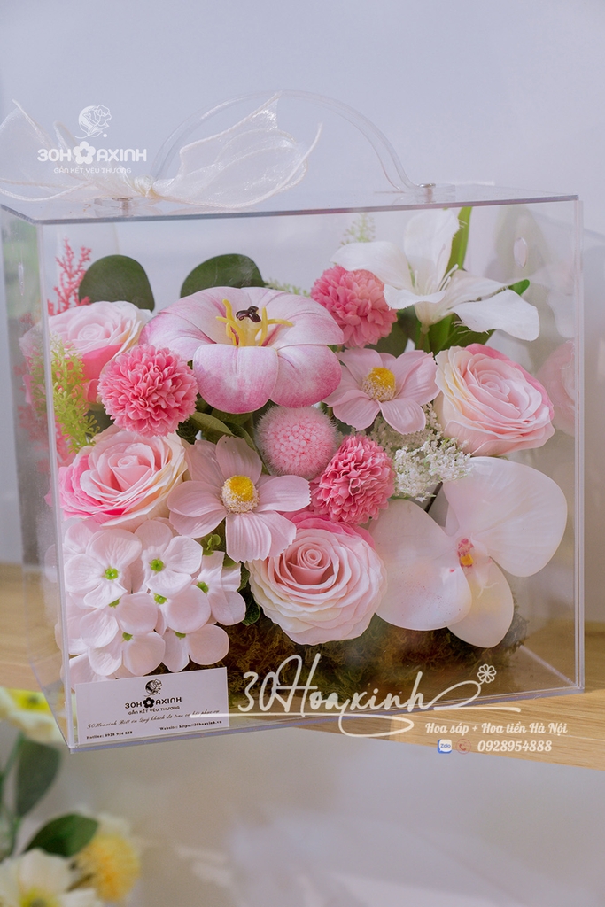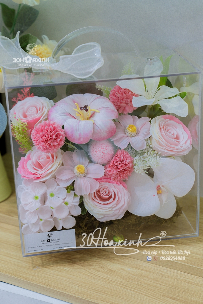 Bên trong chiếc vali trong suốt là những bông hoa sáp mềm mại, được sắp xếp khéo léo, phối cùng ánh đèn led lung linh khiến món quà càng thêm rực rỡ và sang trọng. Mỗi bông hoa như thay lời muốn nói: “Cảm ơn vì đã ở bên cạnh, và mong bạn luôn hạnh phúc.”
